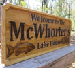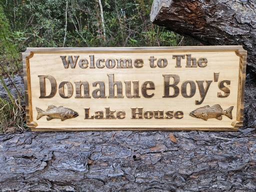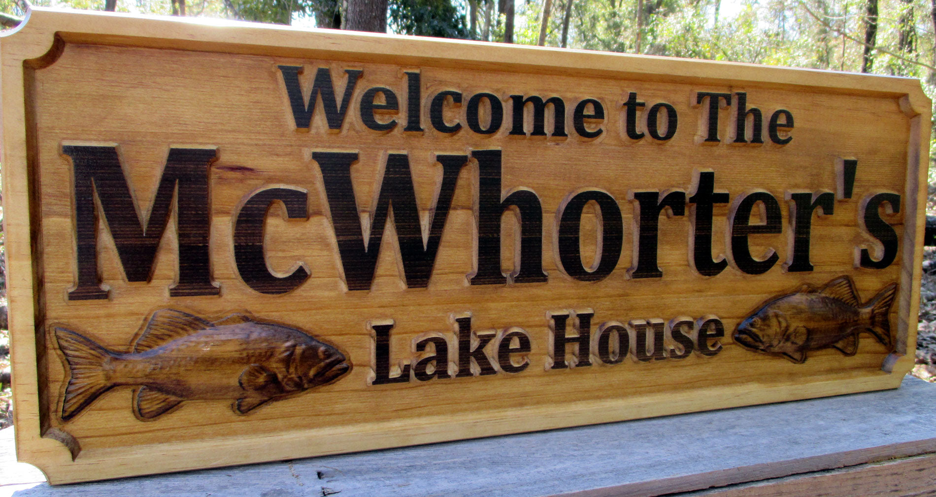 Custom personalized wood carved Lake House sign with 3D graphics. Decorate your Lake house in style with custom wooden wall art made just for you. This custom made wall decoration is crafted from solid Select Pine hardwood and perfect for your Cabin in the Woods, Fish camp decor or Mountain retreat wall art.