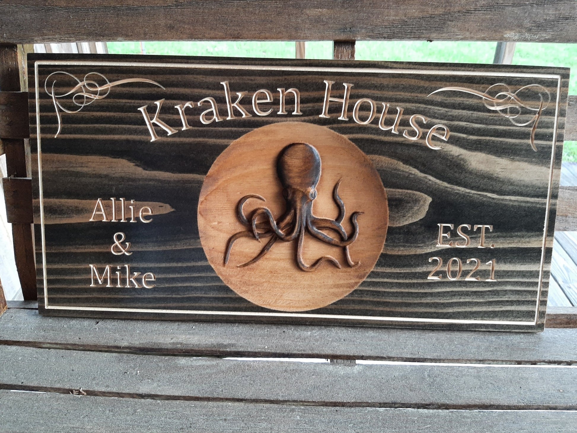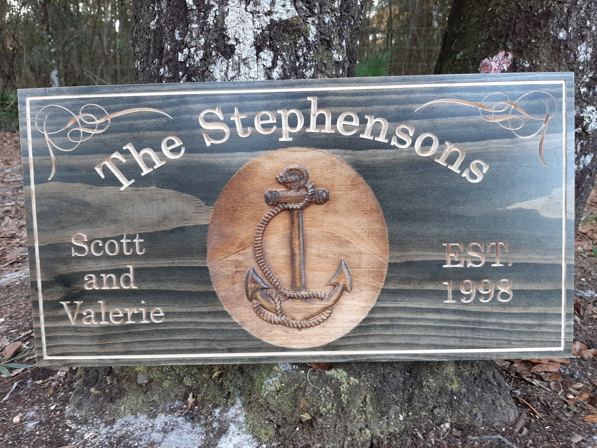 This rustic beauty features the Family last name, a 3D dished graphic centerpiece with the Couple’s First names carved on the left of the graphic, while the Established year is on the right. We have many fish, boats and other Nautical 3D graphics to choose from.