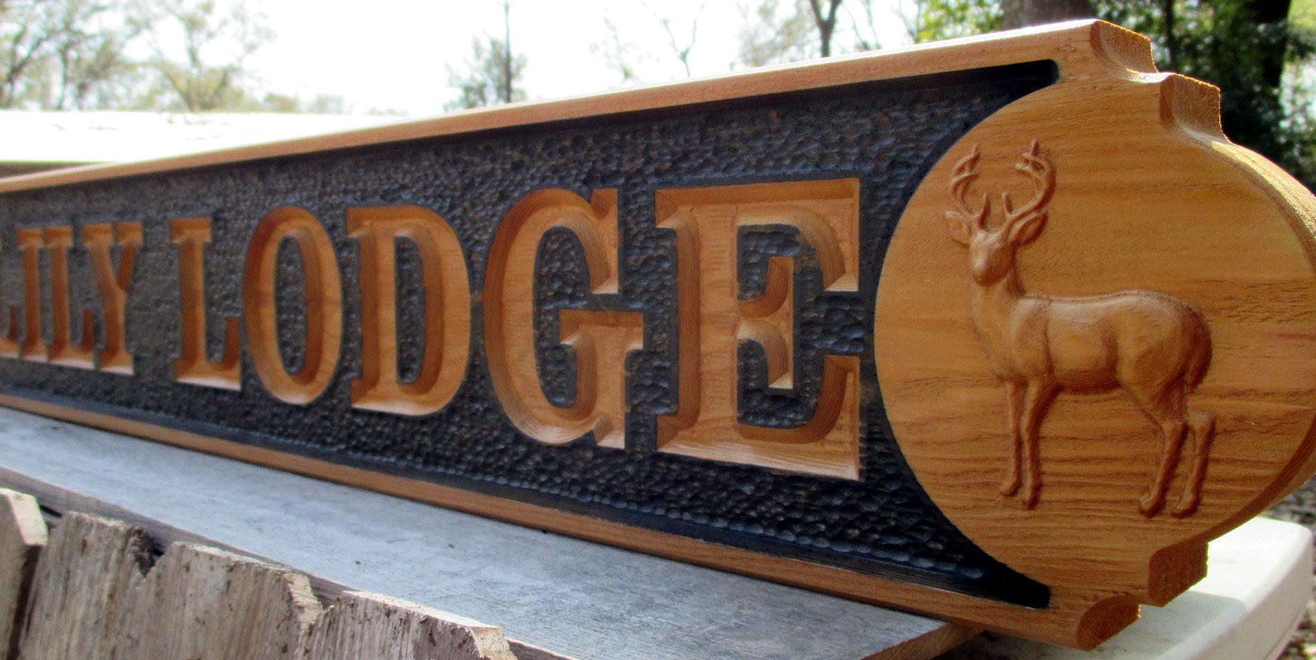 Personalized Red Cedar Deer Hunter Cabin quarter board style name sign, a surefire way to wow your guests as they enter your hunt property or display this to mark your rustic log cabin in the woods. This solid Cedar quarter board type sign is carved with your personalization and has two brilliantly detailed 3D Deer Buck graphics on each end.