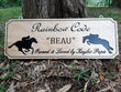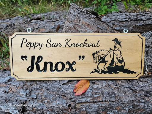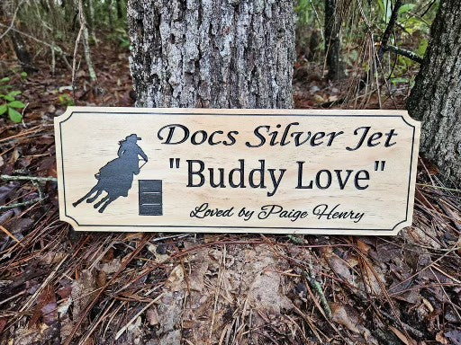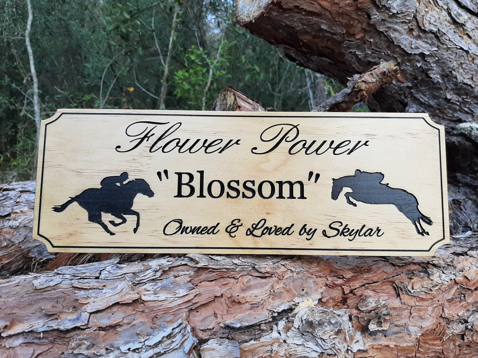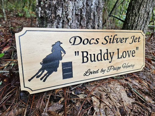 Personalized Racehorse, Show Jumping, and Barrel racing horse custom carved Horse stable name plaque. This unique Horse name sign makes a great Exhibit or show piece for your Horse's stall. This custom sign is carved from a single piece of American Select Pine and features a profile border, silhouette graphics of a jumping horse, racing horse and your personalized text.