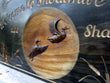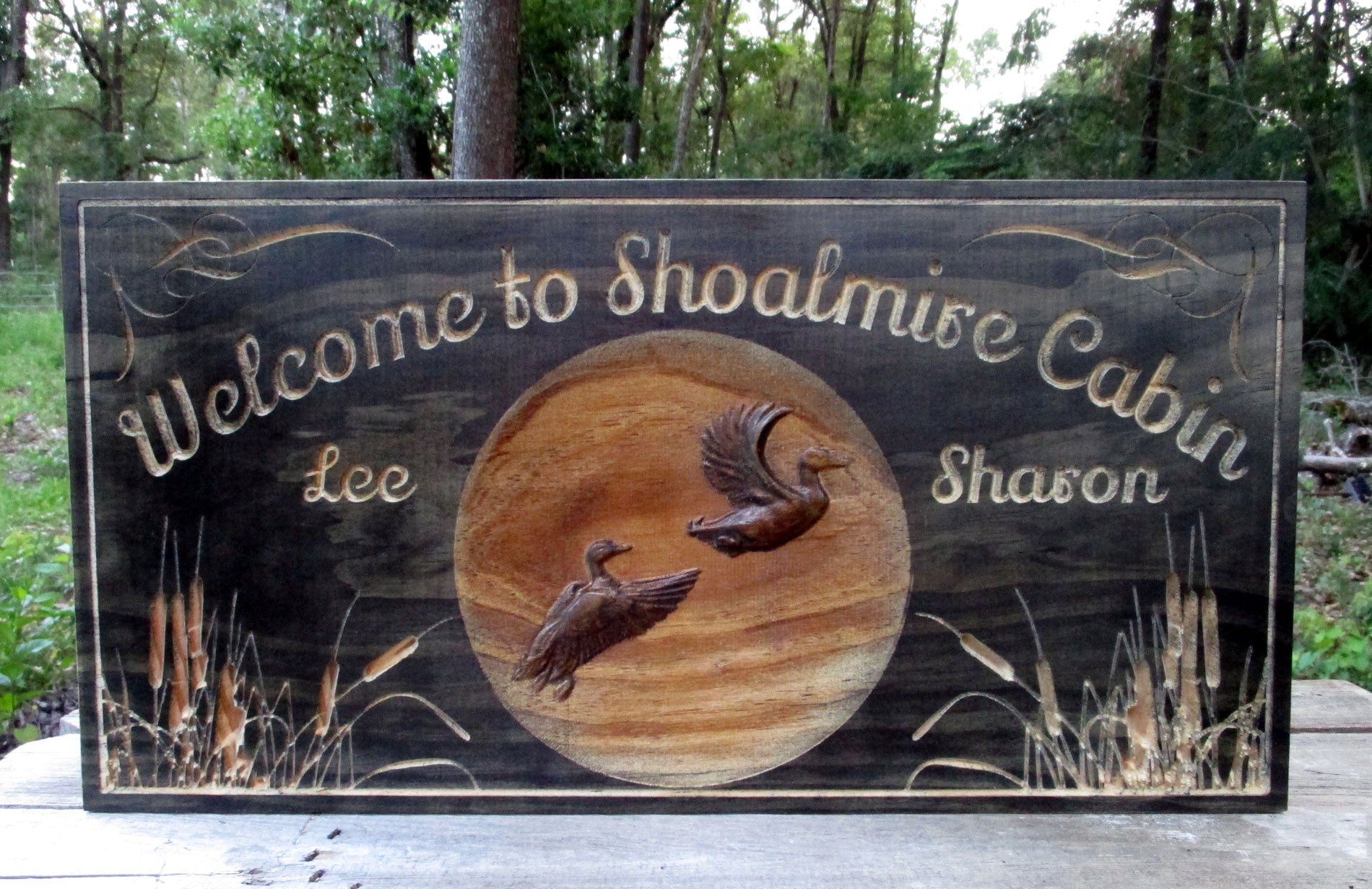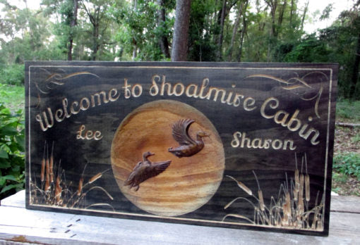 The rustic wall art showcases a 3D wood-carved design of flying ducks as the focal point, accompanied by your custom text, established date, and cattails, all intricately v-carved into an ebony-stained American Select Pine hardwood piece.