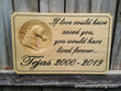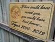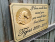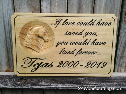 This is a stunning Personalized Horse Memorial Name Plaque. The perfect way to honor and memorialize your lost pet forever. This beautiful 3D carved sign is cut from a single piece of solid Select Pine and features a dished 3D Windblown Horse Head (other 3D graphic choices are available). The scripted text shown and profile borderline are carved into the wood and painted black, making these features really stand out in contrast to the Golden Oak stained color of the Pine wood.
