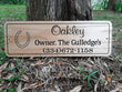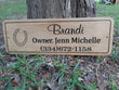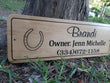 Custom personalized wood carved Horse stall name plaque with Owner name and Phone number made from either Select Pine or solid Red Oak(add $10). There is also a v-carved Horseshoe graphic at one end. The profile border and all text are painted in black. This makes a great exhibit or show piece for your Horse's stall.