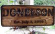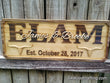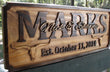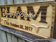 Personalized custom wood carved Longhorn Family Last Name sign made from solid Select Pine. The Family’s Last name is the centerpiece in raised, ALL CAPS text and the Couple’s First names are layered on top in a fancy Script font. The Established date is the Wedding or Anniversary date, or it can be the established date of the home/farm.